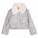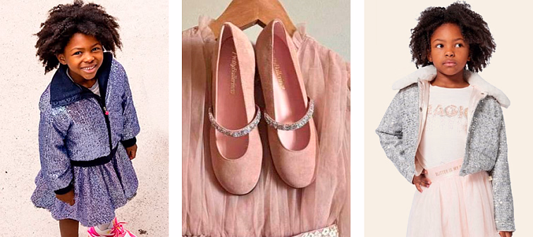 Для девочек постарше подойдет эффект элегантности и сдержанного гламура. Платье прямого кроя в нежном пастельном оттенке с деликатным блеском создает утонченную линию силуэта и смотрится благородно в любых ракурсах. Это удачный выбор для атмосферных портретов, семейных фото и спокойных новогодних кадров. Чтобы придать образу праздничный, зимний характер, добавляем эффектную куртку Silver в пайетках, декорированную мехом. Финальным штрихом станут туфельки Angelis Dust с пряжкой из камней — легкий блеск, аккуратный силуэт и ощущение “особого случая”.